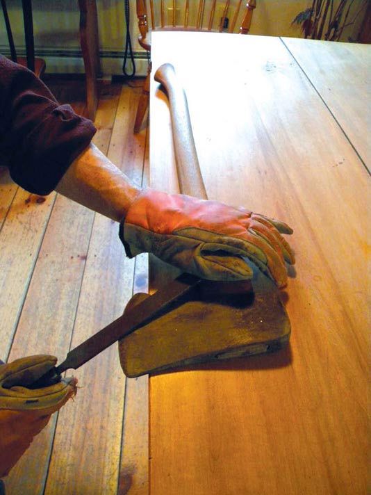 Start the process of sharpening your ax by clamping the ax head down on a flat surface. Then, while wearing gloves, run the file into the cutting edge at the desired edge bevel angle – 15 degrees is a good goal. Since you’re running your hands toward the sharp edge of the ax, it’s a good idea to make a guard by sliding a piece of leather or stiff cardboard onto the tang of the file; this will protect your fingers.