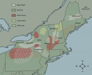 Black cherry does little better than oak in northern portions of the region. And when it comes to cherry, there is simply no debate. The best – not just in the Northeast, but in the world – grows in northwest Pennsylvania’s Potter and McKean counties, and in the flanking counties of Tioga and Warren and the adjoining stretch of southwestern New York. There, cherry grows quickly and with a narrow sap-ring; like red oak, cherry is sought for its heartwood. The cherry of this region grows in an even, rosy hue with very low sap content and little defect of any kind: few knots and hardly any mineral or “gum” deposits. In short, it makes perfect cabinetry and furniture.