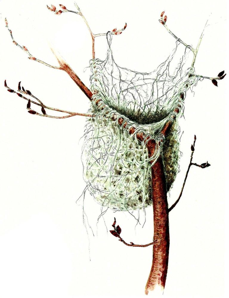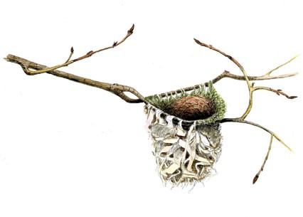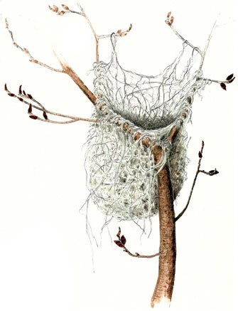 Ruby-throated hummingbird, Archilochus colubris: Ruby-throated hummingbirds garnish their walnut-sized nests with lichens to “mimic” bumps on limbs. Nests are lined with soft white plant down. The only nest that is similar in habitat, placement, and appearance, though it is substantially larger, is that of the wood peewee.