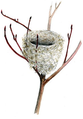 American goldfinch, Carduelis tristis: American goldfinches make solid and tidy cup nests out of plant fibers and line them with thistle down. Nests are usually found out on a branch of a deciduous tree in fairly open habitat, such as a bog, edge of field, or suburban area. The nest is built with its base on the branch, not suspended like that of the vireo. Droppings are a dead giveaway (although they may be washed off by late winter), since goldfinches are the only local open-nesting songbird that allows feces to accumulate on the nest edge.