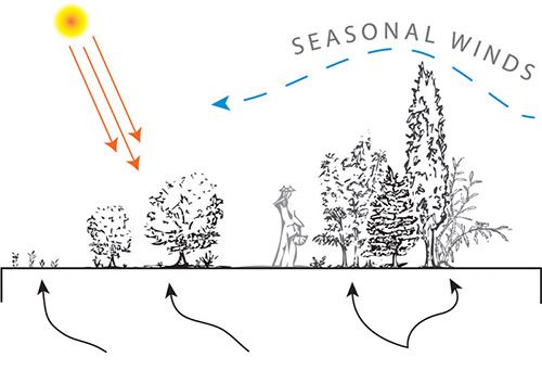 Falk designed this “shelterbelt” arrangement of increasingly lower-growing plants (and mushrooms) to buffer winds, maximize sunlight, and trap warm air. The resulting conditions will help each plant or fungus thrive and produce maximally. With successively decreasing plant heights, each “layer” has both top and side exposed to the sun.