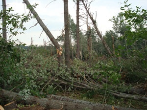 Northern New England and New York can also be visited by spectacular blowdowns from other wind events, such as derechos (pronounced deh-RAY-cho), which are straight-line downdrafts that occur along frontal boundaries and cause damage over hundreds of miles. Residents of the Adirondacks and western Massachusetts may remember the 1995 derecho that caused moderate to severe damage on almost 90,000 acres of timberland.