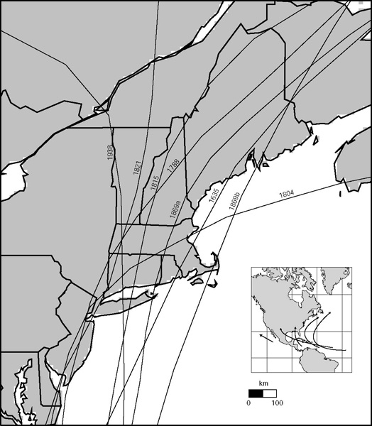 Major hurricanes have caused extensive blowdowns of forest stands and widespread gap disturbances in a belt across southern to central New England. Older residents can recall the infamous 1938 hurricane that blew down vast areas of forest from the southern New England coast well into Vermont, New Hampshire, and Maine. Researchers from the Harvard Forest estimate that a woodlot within the area south of a line from Boston to Hartford and central Long Island can expect a major hurricane on average every 85 years. Moving inland, any given spot within central Massachusetts and southern New Hampshire is likely to experience such a blow every 150 years, while a woodlot in southern Vermont, central New Hampshire, or coastal Maine could expect such an event about every 400 years on average. Pennsylvania and most of New York lie to the west of the major hurricane belt. [See hurricane map at end of article.]