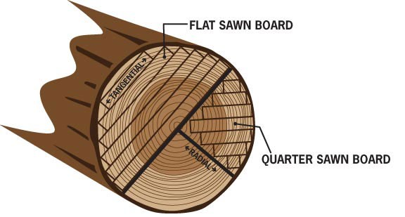 Wood typically shrinks roughly half as much in the radial direction as in the tangential direction: in the range of 5 to 7 percent for our northeastern hardwoods, and 2 to 4 percent for our softwoods. This explains why quarter-sawn lumber (boards where the width is in the radial direction) is often considered more stable than flat-sawn lumber, and is sometimes specified for premium products.