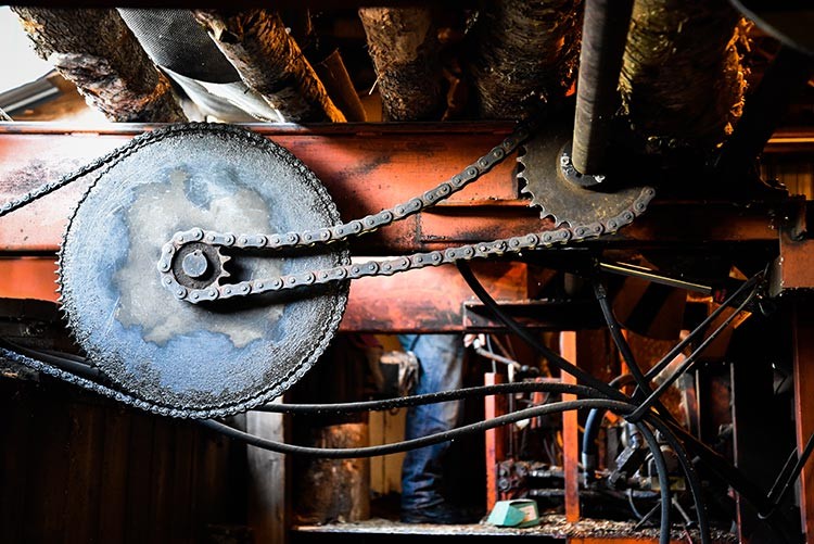 While there’s plenty of manpower involved, the heart of the operation is a 1988 CMC Technology wood processor that can cut and split logs into 16- to 24-inch pieces, roughly 2 cords an hour, and send them clunking down a conveyor belt into a dump truck. In the spring, Chaloux Brothers delivers green wood to customers immediately after it is cut and split. Wood processed over the winter is dumped in the wood yard behind Roger’s house and stacked by hand into 24-foot-long rows four feet high to dry for six to nine months. That way a cord of dry wood can be easily measured out for delivery starting in late August.