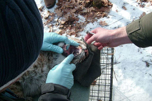 The study has a number of goals. First and foremost, the state of New Hampshire wants to know how many bobcats they have. This study will produce range maps that will be used to estimate state-wide density. To make these numbers more definite, the scientists are establishing a DNA record of the trapped cats so that in the future, scat can be collected and linked to either a known cat or an unknown cat. (A cat sheds cells from its gut when it defecates, making DNA analysis of feces possible). Once a good population estimate is established, and if sufficient numbers are there, the state might open a tightly regulated bobcat hunting and trapping season, similar to those in neighboring Maine and Vermont that have continued without interruption from the 1970s.