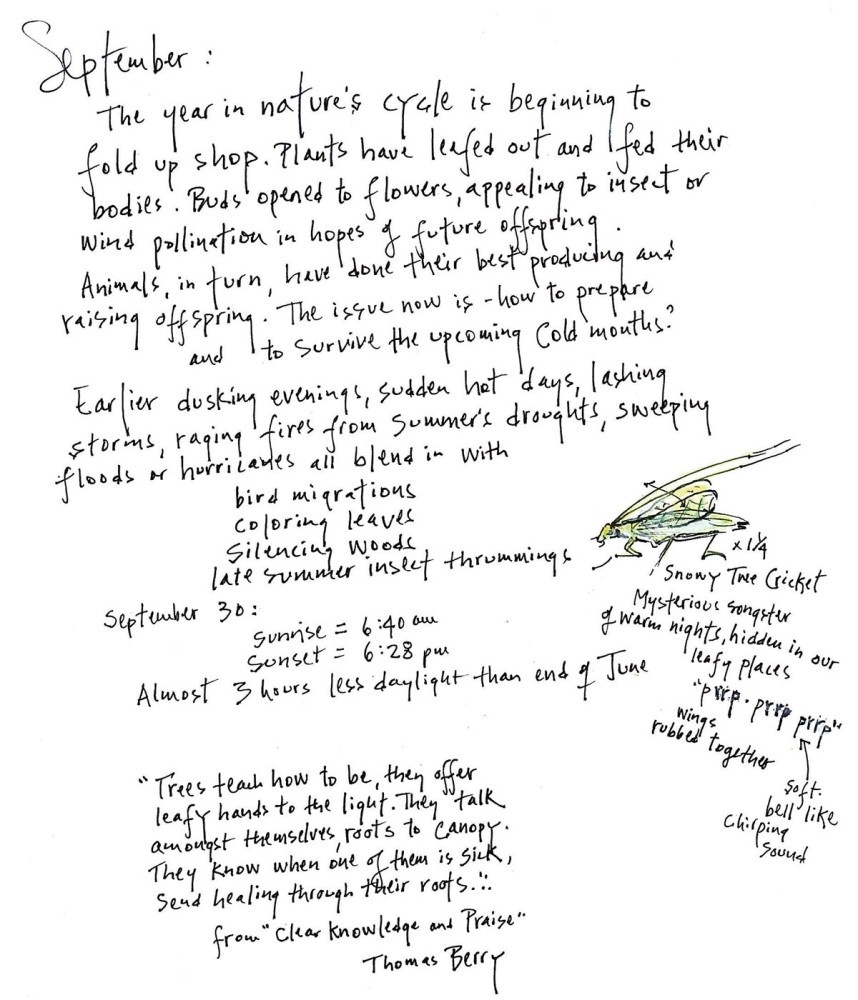 Naturalist, artist, and writer Clare Walker Leslie inspires people around the world to pay attention to the nature around them and to discover their own distinct way of reflecting and recording their observations through nature journaling. Clare has kept her own personal journals for decades, a foundation of thought and practice that has informed her teaching and publication of 13 books. In A Year in Nature: A Memoir of Solace, Clare shares pages from her own nature journals. In the complete book, she begins with the winter solstice as a symbol of renewal and lengthening days, threading contemplations about the seasonal cycles and associated patterns in nature with records of joy and solace as she explores her place in the world. Each month is a compilation of her experience with family, teaching and travel, and observed places, ending with a nature summary for that month. In these excerpted pages we have an autumnal offering, beginning with the landscape of her home in Vermont.