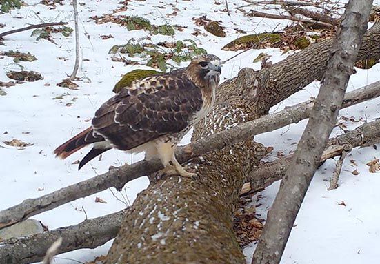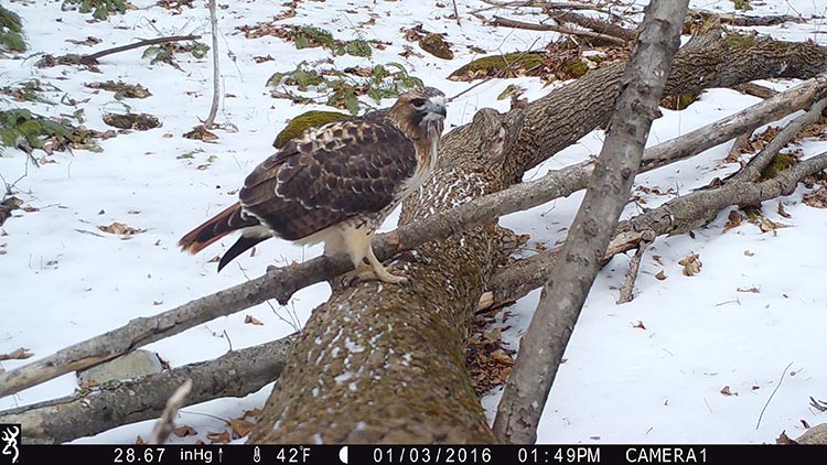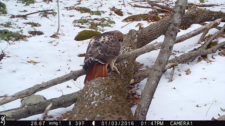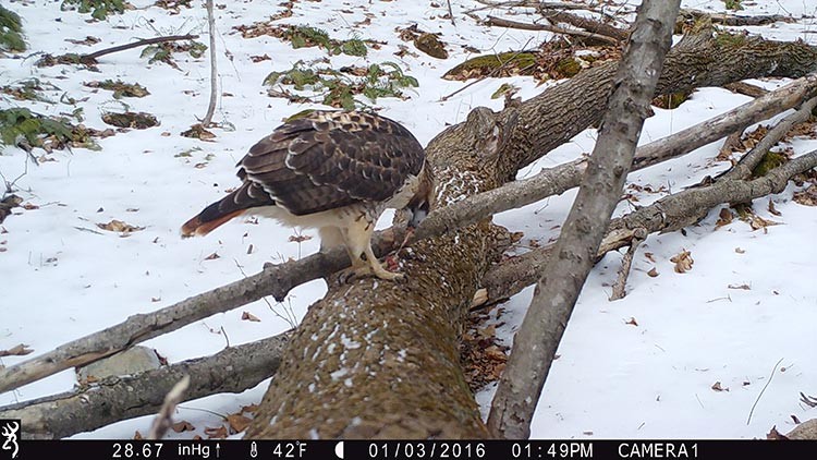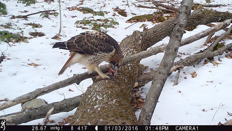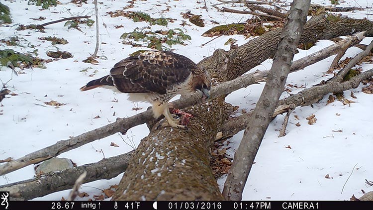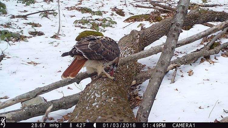 So we tweaked our technique slightly, setting the camera up pointing away from the pit along a fallen log. We wedged a few meat scraps underneath a branch on the log as a means of holding an animal temporarily in the frame. The next morning our efforts were rewarded with this Muybridgian sequence of a red-tailed hawk taking the bait.