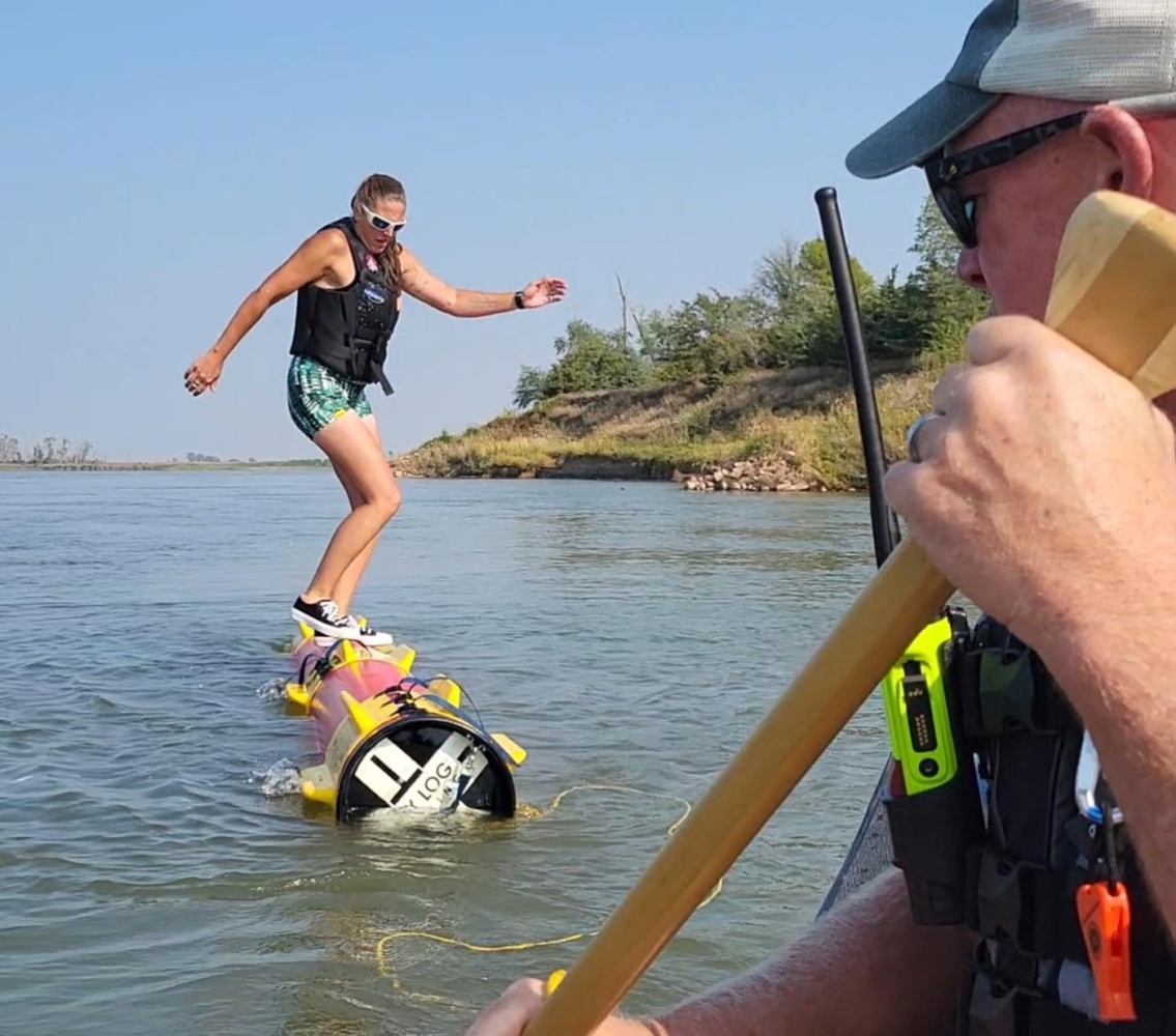 For years, we competed with and traveled with a 600-pound western red cedar log, which isn’t the easiest thing to travel around the country with. Several years ago, a lady in Minnesota and her mom, who are world champion boom runners and log rollers, created a synthetic log. It weighs 60 pounds empty. You throw it in the pool and fill it up with water, and then it weighs as much as a log. When you buy a log, you get paddles you can put on it – she calls them training fins. It’s kind of like a paddlewheel on a paddlewheel boat. We don’t need these fins for a show, but we realized early on that if you put them on, you can use the log to travel. We bought one of these logs to try it, and we were driving out to Nebraska for a show and stopped at this little place called the Riverview Roadhouse in Le Claire, Iowa, right on the Mississippi River. At some point that night, Mike looked out over the river and said, “Do you think you could log roll across that?” That turned into a year of planning.