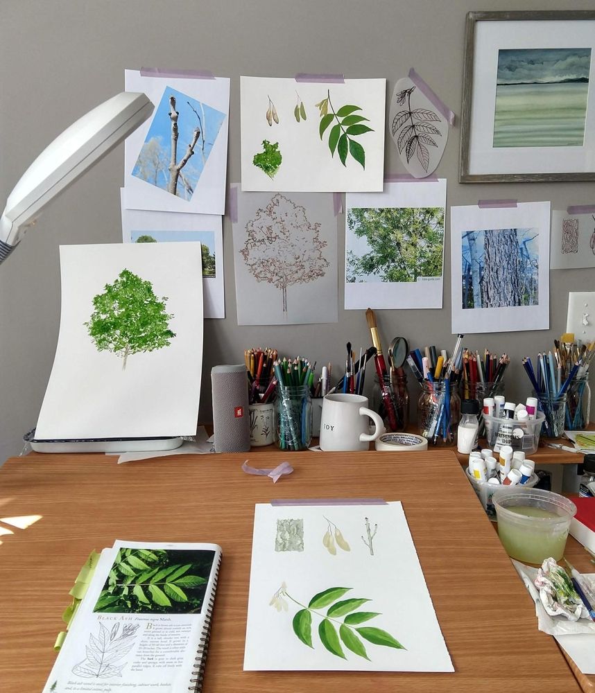 I’ve tried to combine my passion for science and the environment with art. I’ve worked with the head botanist at the Coastal Maine Botanical Gardens to create a Maine aquatic field guide, which includes about 30 very accurate line drawings of different aquatic plant species. I worked with the Land & Garden Preserve on Mount Desert Island to create educational posters to have on display during different seasons, so when people come to walk the trails, they can see what’s blooming at that time and also the pollinators associated with those native plant species. It was a lot of design work to get it all to fit on one page – it’s a lot of information – and have it look attractive so that people are engaged and want to learn more about it.