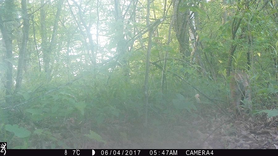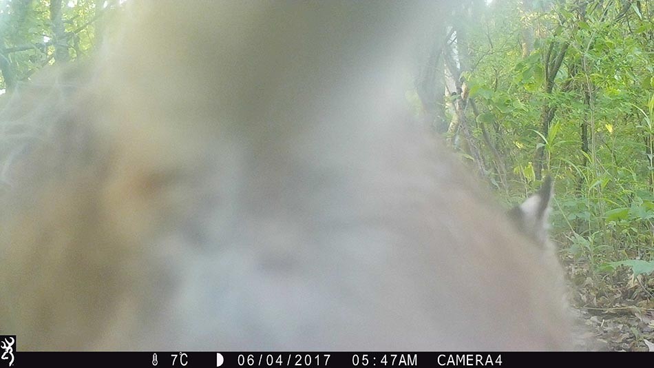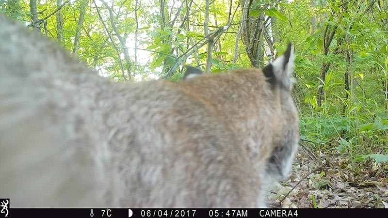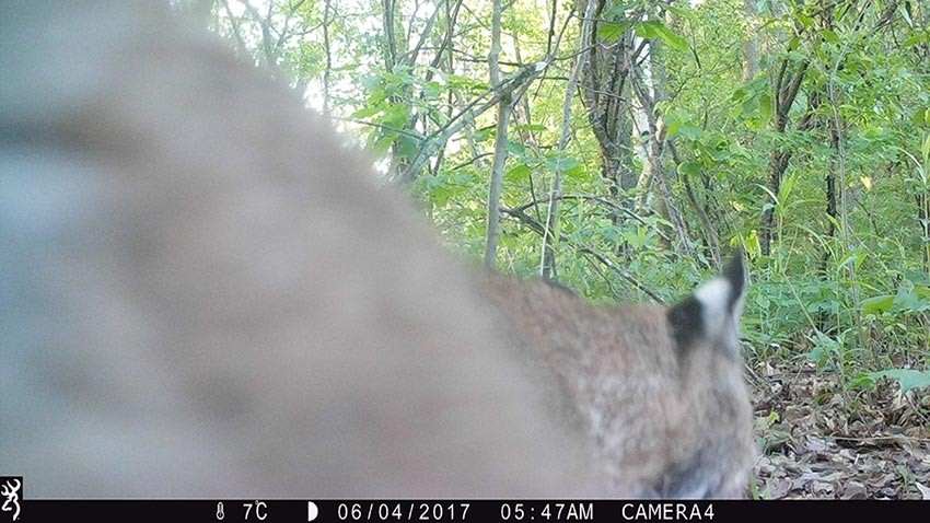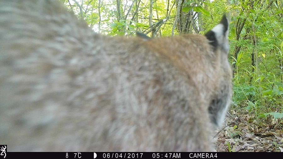 Weeks later, while downloading the photographs, the source of the smudge became glaringly obvious. The first shot showed a conspicuously tufted ear with black and white pelage; the first bobcat sighting from their summer-long study. (Bobcats are uncommon visitors to our cameras, so the photograph caused great excitement in the lab.) After the cat’s ear passed the camera, the next image showed more of the animal’s side against a crisp backdrop of vegetation. Next, a blur of fur seemed to indicate a feline rear end approaching the camera, and the following image left little doubt: a raised tail and a blur of fur with the cat’s ear still in plain view.