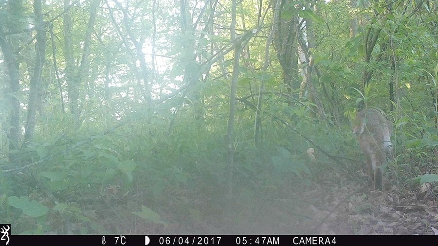 Jade Jarvis and Alyssa Valentyn were maintaining their research trail cameras at Saint Michael’s College when they noticed a brown smudge obscuring the lens of Camera 4. Alyssa used the corner of her t-shirt to wipe it clean and they moved on to the remaining cameras on their route.