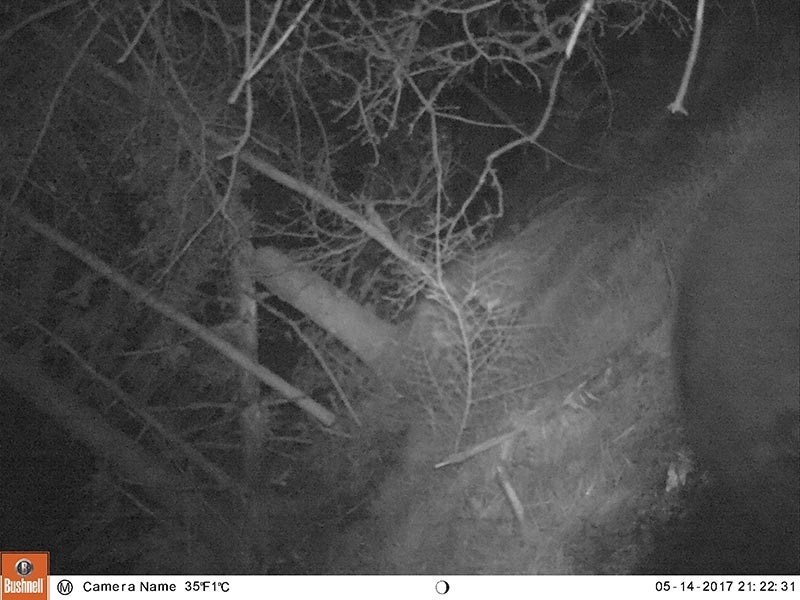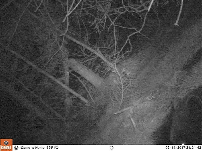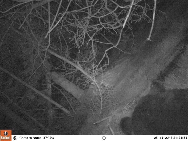 A month later we returned, and immediately noticed something was amiss. The camera had been disturbed and was pointing almost straight down. “Oh I hope we at least got footage of the disturbance,” we thought, but it wasn’t meant to be. Two days after we’d set the camera up – two days – a large black bear came in, at night, from behind, and knocked the camera out of whack.