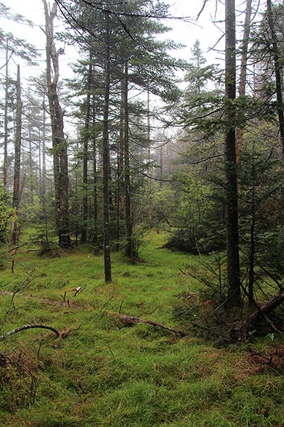 We hiked into the Green Mountain National Forest to a place about five miles from any maintained road. It was an unmanaged forest, so the edge habitat we focused on was an out-of-place-seeming fen in a sea of spruce-fir. There was some sphagnum moss on the ground, but the understory was mostly sedge; you could see where the animals were working the inside edge to and from a pocket of open water. We set up the camera at the edge of the open water, pointing directly down the sedge-trampled trail. There was a long window in which to capture anything that was coming and going.