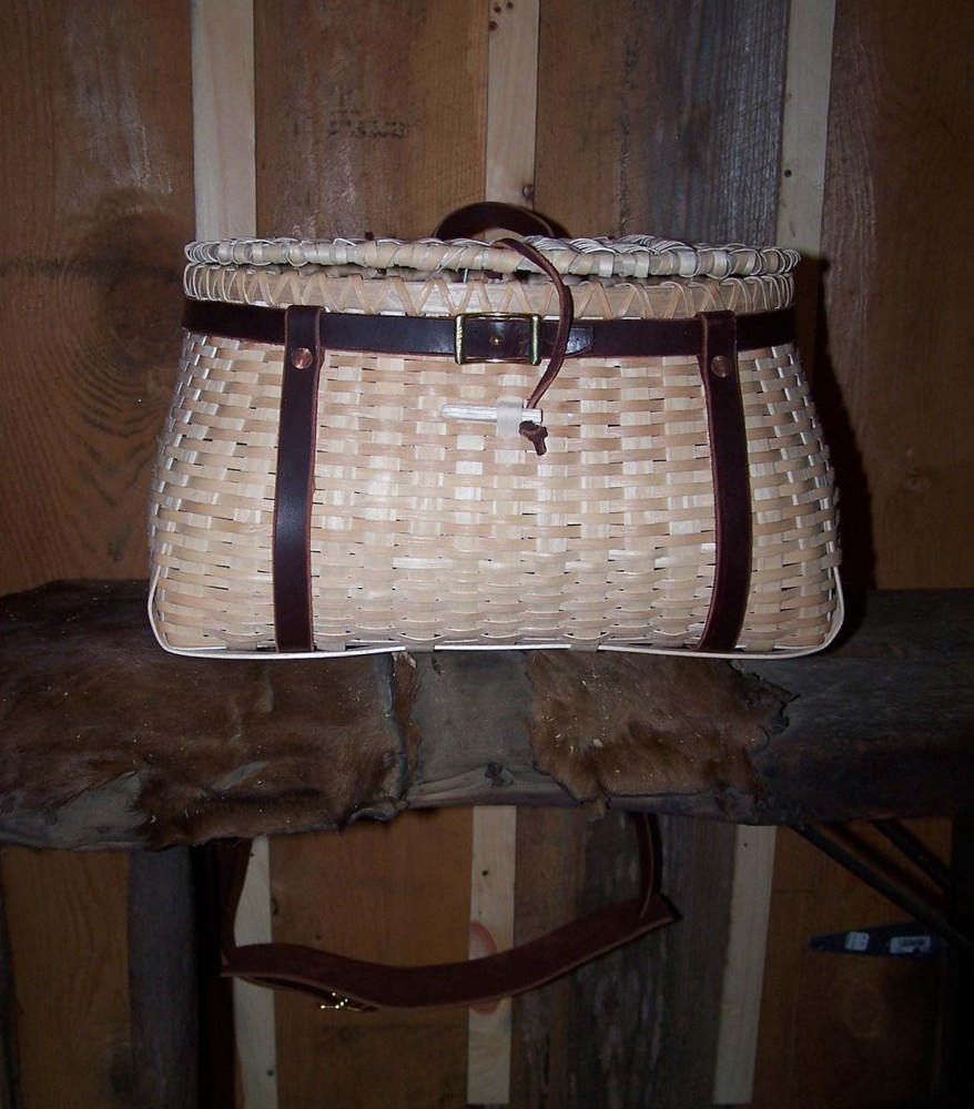 Sherry wanted to learn how to make utility baskets. She ended up getting a grant to work with Newt Washburn in Bethlehem. Newt was a famous basket maker, and he was 92 years old then. He was too old to pound any ash to make baskets with, so I went up and started doing that for him. You have to make different tools to cut the ash with and tools to split the splint with, and different molds for different baskets. It got to a point where I was doing everything but making the baskets. So I started making the baskets. I cut and use brown ash and make utility baskets – pack baskets, fishing creels, and gathering baskets.