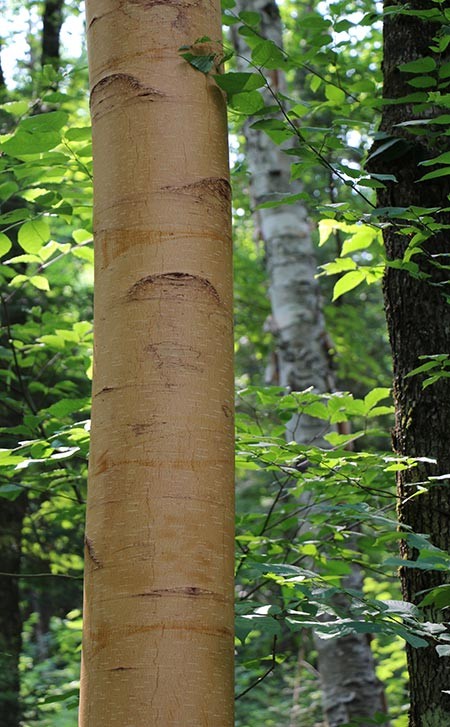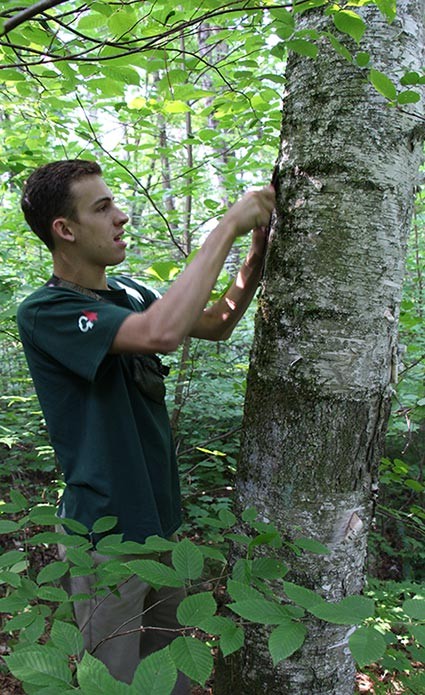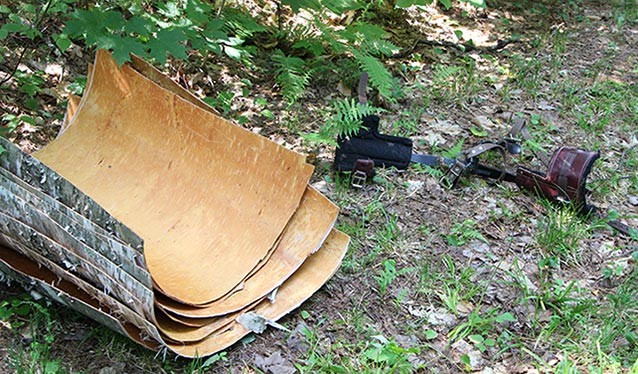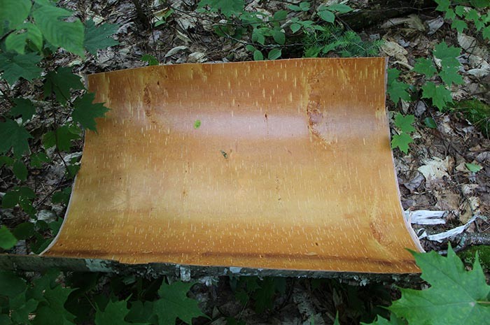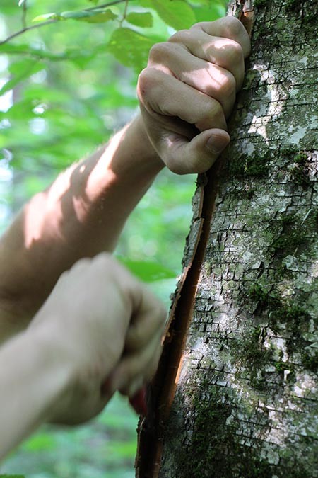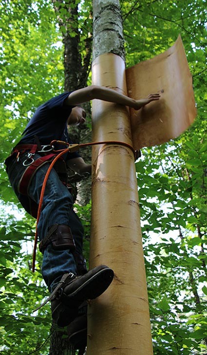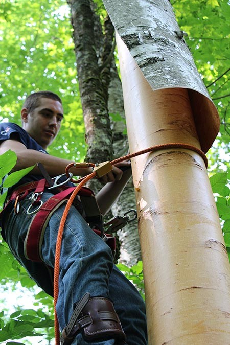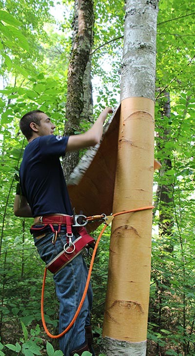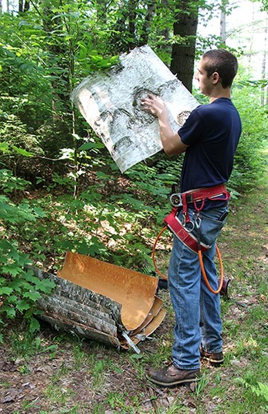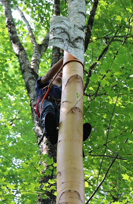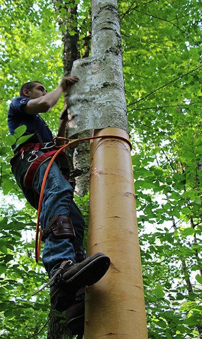 Both men donned their climbing gear – the only tools they carried were a utility knife and a putty knife. “It’s a perfect day for this,” said Tim as he scored the bark of the first birch with his knife, cutting a line about three feet long into the trunk. “Sunny, warm, right after a good rain is ideal.” He used the putty knife to get the bark started on the left edge of the score mark, then worked his fingers in between the outer and inner bark. With moderate effort, he peeled the sheet of bark a quarter of the way around the tree. Then again. Then the last pull made a half rotation and the bark fell free. “You’ve got a dry side and a wet side here,” he said. “It should get better as I go up.”