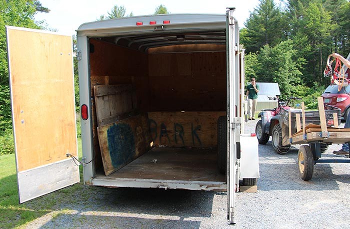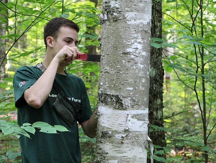 The birch bark peelers arrived in a pickup pulling a covered trailer. There was a 4-wheeler in it, a smaller trailer, and sheets of cardboard and stickers for the bark. They unloaded the 4-wheeler and secured a chainsaw to the front rack, some climbing gear to the back rack. They rode out a logging road and stopped to cut a red spruce that had fallen across, then drove up a hill to where the spruce and white pine were joined by hard maple and paper birch.