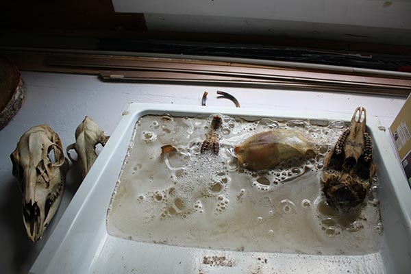 When I was a kid I used to skin the skulls and then boil them, but I was never really happy with this method. I’d boil for hours before the flesh would loosen, and even then, I’d have grizzled bits that stuck like glue. It smelled; it seemed to shrink the skulls; it ruined pots. (If you’re thinking: oh, his poor mother, you should know that my elementary-school-teacher mom was the one who got me into this macabre craft in the first place.)