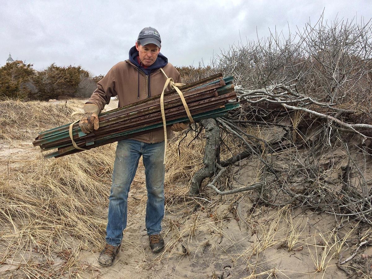 I volunteer for The Nature Conservancy, working with piping plovers. This year will be 20 years doing it. They joke about me being their unpaid employee. I’m kind of proud of it. I put in over 500 hours a year between April and mid-September. We have to set up the fencing every year on April first. Because of what I do – my type of fishing is very physical – I’ve got some pretty good arms. I’m really good at hammering in these steel poles, because it’s going into cobble – it’s not beach sand at all. Then it’s putting up the predator exclosures when we find a nest. Basically, it’s wire with two-by-four-inch openings, and the plovers can pass through very easily, but the predators can’t. You put mesh netting on top so crows and gulls can’t get in. It allows the nest to be protected until the eggs hatch. And once they hatch out, the chicks are precocial, so they’re up running and feeding themselves. We’ve had our good years and our bad years. Last year was tough, because there was a big explosion in the fox population. The crows have been getting into them a lot lately, too. And we’ve had skunks going through the wire. You’ve got to do something to help these poor little birds if you spend enough time with them.
