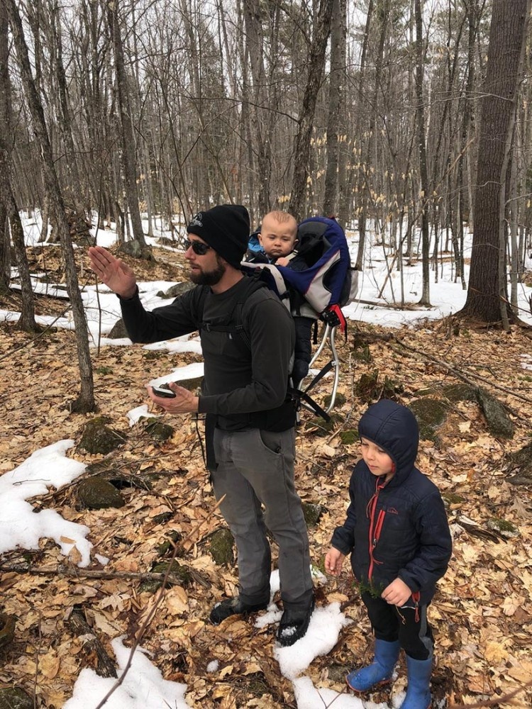 Randy Kimball walks through a woodlot in Stoneham with two of his sons.