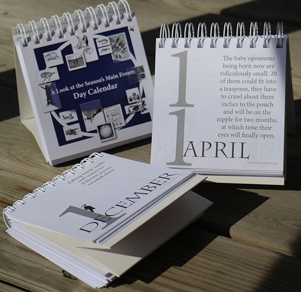 As I write this I’m listening to a tractor trailer back up to the office; it’s here to deliver the first shipment of our new seasonal nature calendars. I have a sample on my desk, and at the risk of sounding like a shameless self-promoter, I have to say that it’s a handsome product. Simple, clean, retro. Three hundred and sixty five little squares, each containing one of Ginny Barlow’s fabulous nature observations that allow us to remember, while we sit at our desks, what’s going on outside. I especially like that there’s no mention of cultural milestones: that on March 17, male striped skunks are prowling and covering a lot of territory – “unless they get hit by cars, as they often do;” that July 4 is simply a day when whirligig beetles are feeding on small worms and midge larvae. It’s not that I have anything against St. Patrick’s Day and the Fourth of July, I just like the idea of a document that focuses on the world besides us.