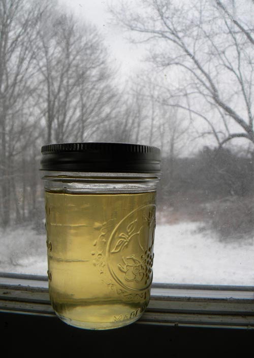 When the fat stopped sputtering and steaming I strained it to remove the cracklings and then filled half-pint canning jars with the pale yellow oil. I couldn’t get a good answer as to whether I needed to hot-water process the jars, so I just threw them in the freezer, where they solidified, sort of, into white lard. Interestingly, though, when thawed they revert back to oil. Everything you read online shows creamy, Crisco-looking fat. I don’t know why this isn’t happening to mine – could it be there’s still too much water in it? It’s pure enough to run an oil lamp.