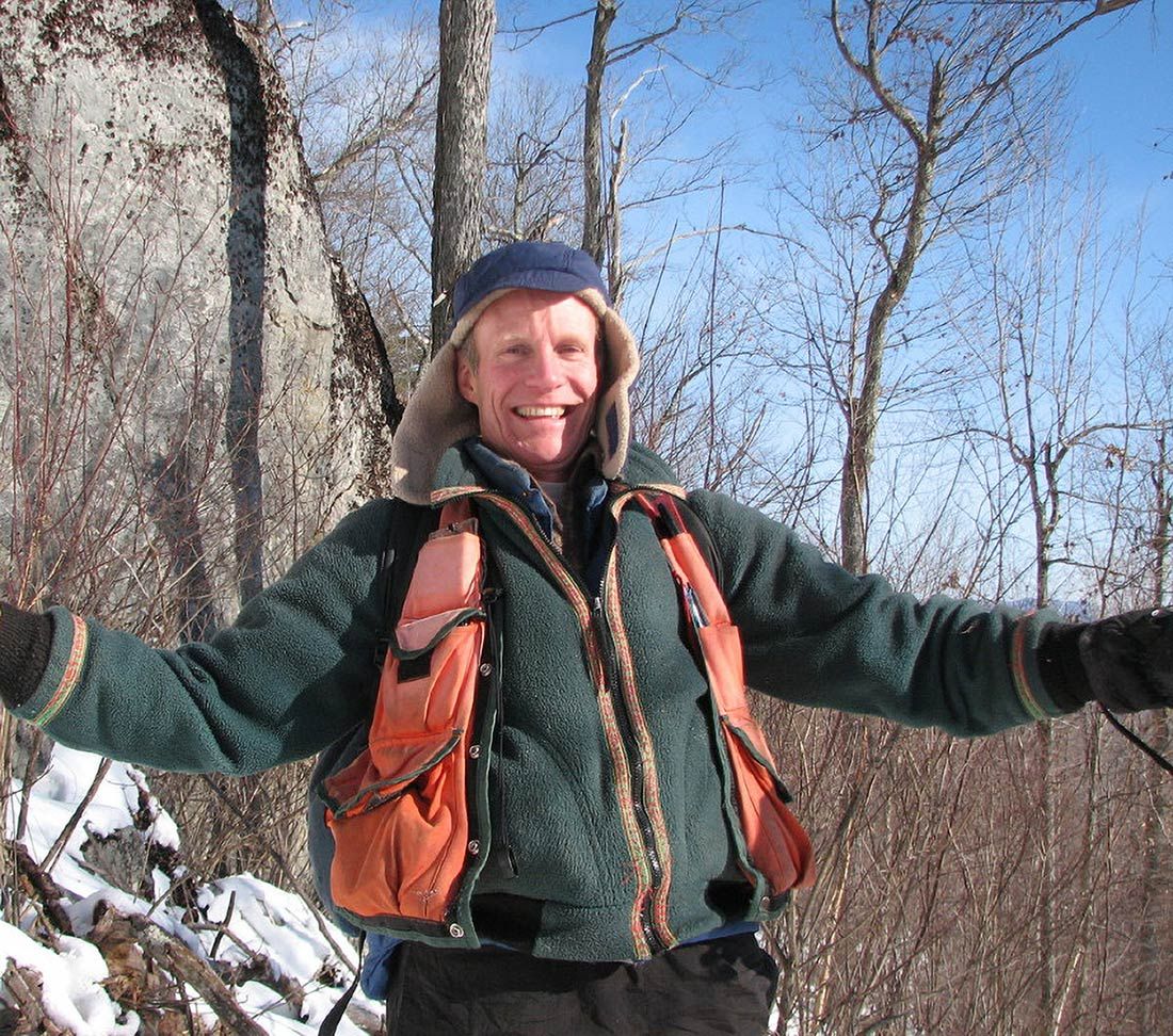 Ecologist Rick Van de Poll’s interests in the forest are as varied as the species that live there. He is a mycologist and a wetlands scientist, a teacher and a mountaineer, a poet and a creator of ecological inventories through the company he founded in 1988, Ecosystem Management Consultants. He spent time in New Hampshire, New York state and New Jersey as a child, in Vermont and Mexico as a teenager, and in Washington, Oregon, and California during his undergraduate and graduate studies. He has hiked the Appalachian Trail, was the founding president of the Northeast Wilderness Trust, and is the Research Director at Tin Mountain Conservation Center. Keenly tuned to the outdoors, he finds there both frustration with the impact of humans’ heavy footprints on the land – and hope in the resilience of nature. Rick lives in Sandwich, New Hampshire, with his wife Wendy and their rescue dog Addie.
