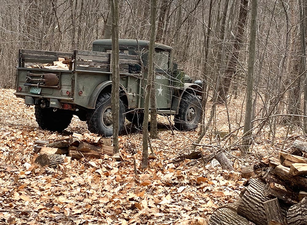 I have a compact tractor I use for a lot of my own firewood work, but it’s about a 35- or 40-minute drive by tractor to get from my place to Little Hogback Community Forest. A couple of years ago, a friend of mine who restores old Dodge trucks found me an M37, a truck made by Dodge for the Korean War. The doors have a white Army star, and right above that it says “Brutus.” I don’t know where the name came from, but it fits. The short wheelbase and high ground clearance make it perfect for work in the woods. The bed has wooden sides that can fold down into seats. In the war, they’d flip those down, and the troops would ride back there. Now, with the seats flipped up, it holds a good bit of firewood, and with the seats flipped down, I can give the neighborhood kids a ride in the parade. It has a mechanical winch – it’s not as fast as the logging winch on my tractor, but I don’t have to spend half an hour getting there.