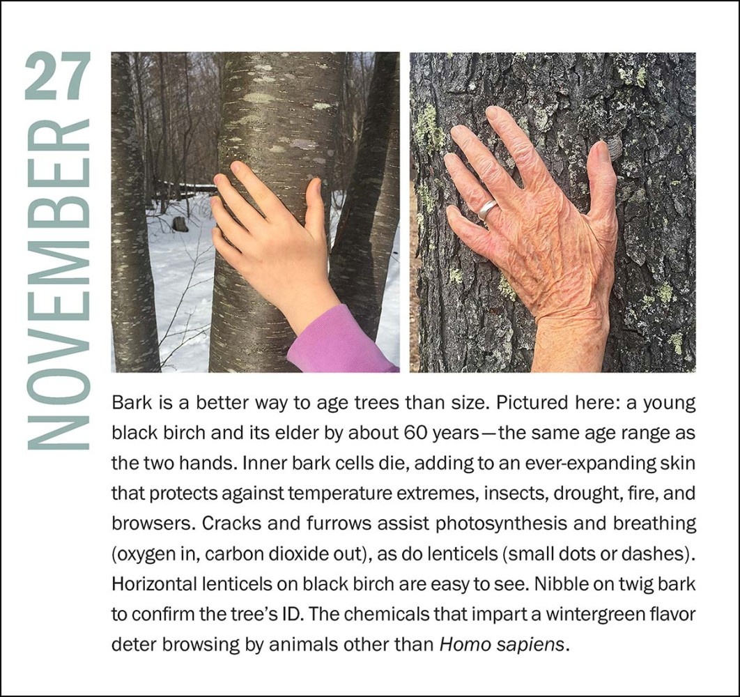 After 25 years writing my Backyard Birder column, I ended it two years ago. By then I was working on a daily nature almanac, eager to pass along a basic understanding of the natural world in a more accessible way than ephemeral newspaper columns. The result is a page-a-day journey through the ever-changing natural year. Each page has a photo and narrative relating to what you can notice happening outside at that time. Many entries are backyard-focused. Whether out the window, out the door, or farther afield, an amazing, life-affirming world goes about its business. I had done yearly calendars before, but they got thrown out at the end of the year. With the almanac, you can jump in on the date at hand and journey on around the year. January 1 is irrelevant to nature’s calendar. Full credit for the almanac’s teepee design goes to Northern Woodlands’ Season’s Main Events Day Calendar, which sat on my desk for years. It’s brilliant.