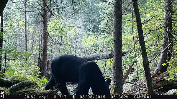 We set up the cameras on August 5, and on August 8 captured this young, male black bear. You can age a bear like this by noting his lanky appearance – adults will appear much stouter and rounder. Also note how big his head looks in comparison to his body. As he matures, this disparity will even out. If someday he gets really big, his head will seem small in comparison to the rest of him. Bear cubs are born as their mother hibernates, and they stay with mom through the first year of their life. The following spring or summer they strike out on their own, meaning our best guess is that this bear is about 18 months old.