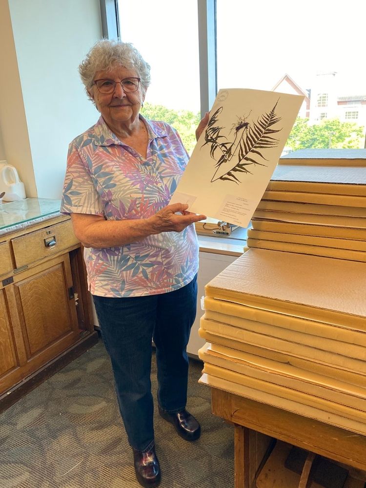 When we retired, I took courses in the botany department. I took a course in systematics with Cathy Paris, and she brought the class over to the herbarium to learn about what a herbarium is. At that time, there were lots of cabinets, and on top of the cabinets were boxes stacked four high. And Cathy waved her hand at those and she said, “If anybody would like to volunteer, those boxes are full of plants that need to be mounted.” And I thought, “Well, that’s something that will last a long time if I do that.” So I started, and I’ve been doing that for 25 years. I’ve mounted more than 50,000 specimens, and that makes me feel good.