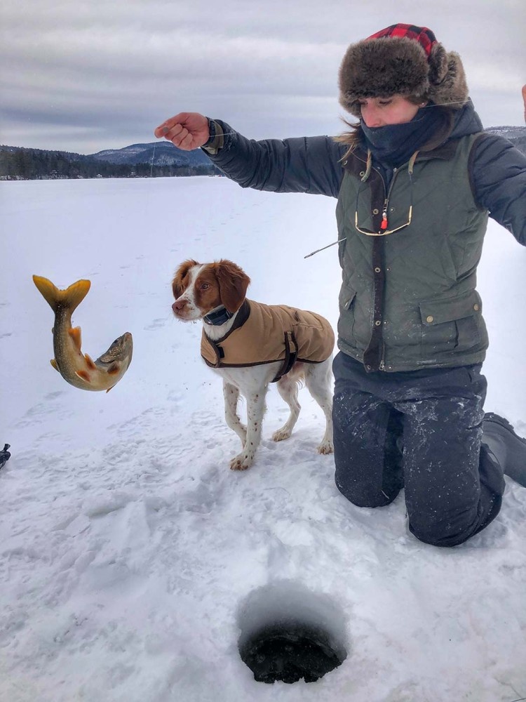 I decided to go for my Registered Maine Guide license in 2018 just to see if I could pass and to give myself more credibility. I passed hunting and fishing. It’s a pretty rigorous test. It’s one hour of oral exams, where you’re being questioned by two people – either game wardens or Master Maine Guides. They just grill you for an hour: name all the flies in this fly box, what type of duck is number 11 on the board, can you dig up plant number 6 on the board, tell me everything you know about this firearm. Then there’s a 100-question, multiple choice written test, a mapping/compass portion, and a catastrophic event scenario. They want to make sure you can keep people safe in the woods. And they also want to keep up Maine’s high standard of requiring guides to have a breadth of knowledge and a depth of knowledge. They expect you to know a little bit of everything. I do some guiding with the Maine Women Hunters group – upland bird hunting with my dog and ice fishing.