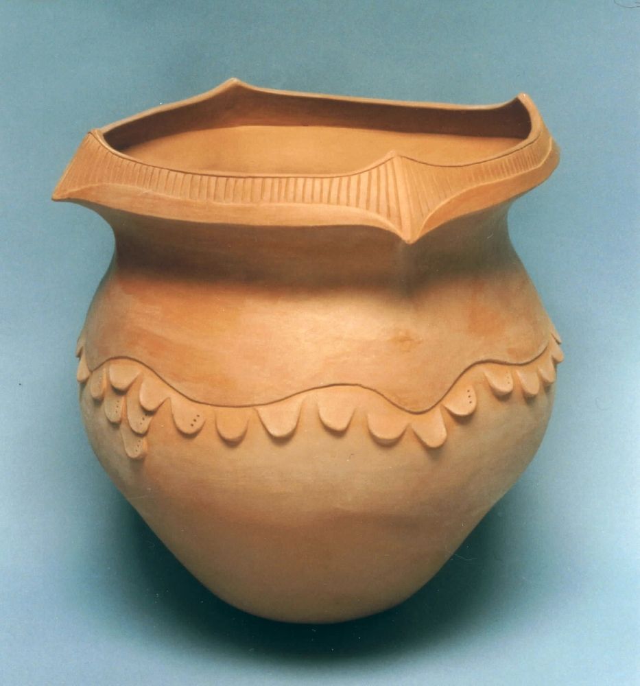 I also began working in pottery when I was 25 or 26. I had started making things that come from our cultural ancestry after college, which I loved to do and still do. I made a lot of things that museums asked me to do, mostly working with wood and copper, and did artifact restoration. I was asked to make a pottery piece: a 17th century-style Wampanoag cooking pot. One of my roommates in college was Tewa from San Ildefonso Pueblo, New Mexico, and her grandmother was a potter. I watched her and how she did it, and what kind of things she foraged for, so later when I got this request, I thought, “Okay, I can do this.”