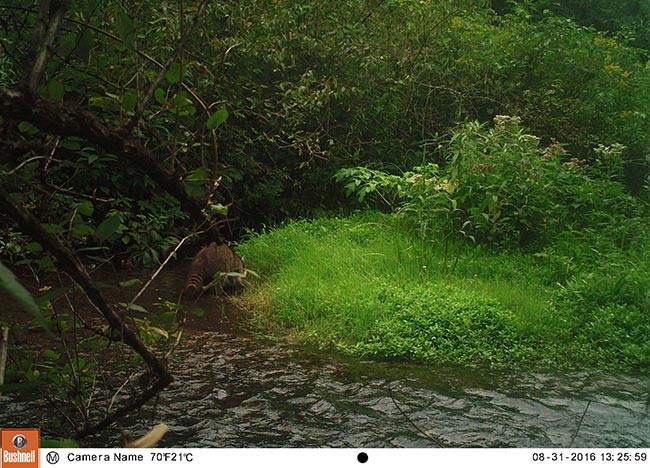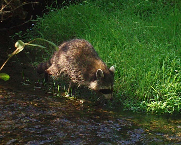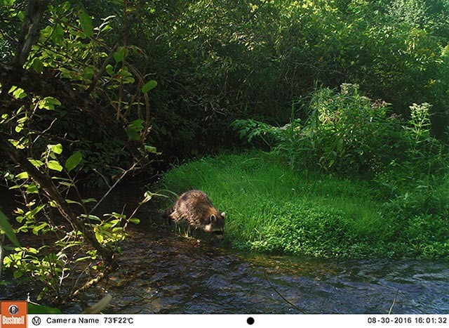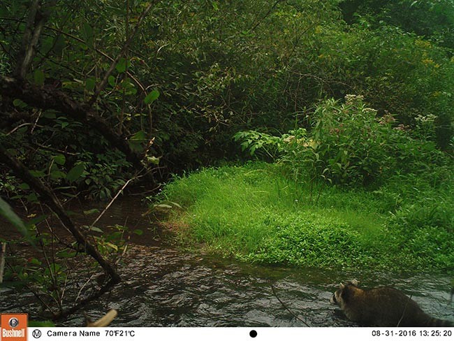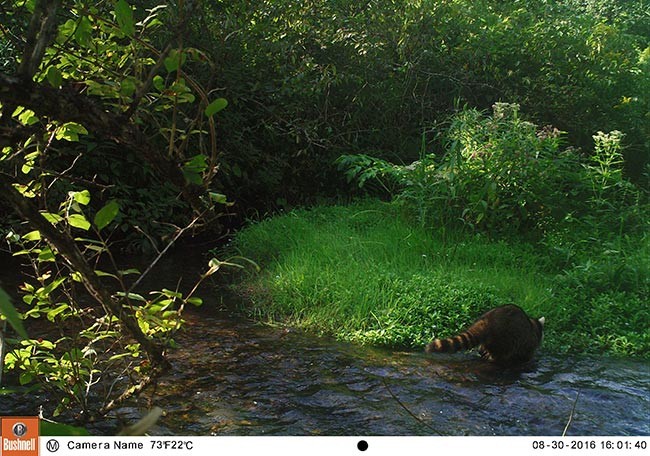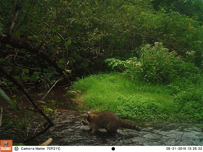 Look at how bright it is at 6 p.m. when the little raccoon enters the frame. Look at the forget-me-nots on the sedge-strewn sandbar, the blooming joe-pye weed, the goldenrods in the background. Is the white flower yarrow? Look at the thicket full of viburnums and alders and willows; even the honeysuckle in the foreground looks good.
