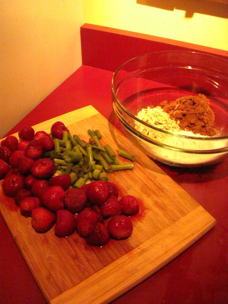Last night, after harvesting a shopping bag-full of stalks, I made Japanese knotweed and strawberry crisp, based on a recipe from The Foraging Family, with a few changes. Here’s my version of that site’s great recipe: