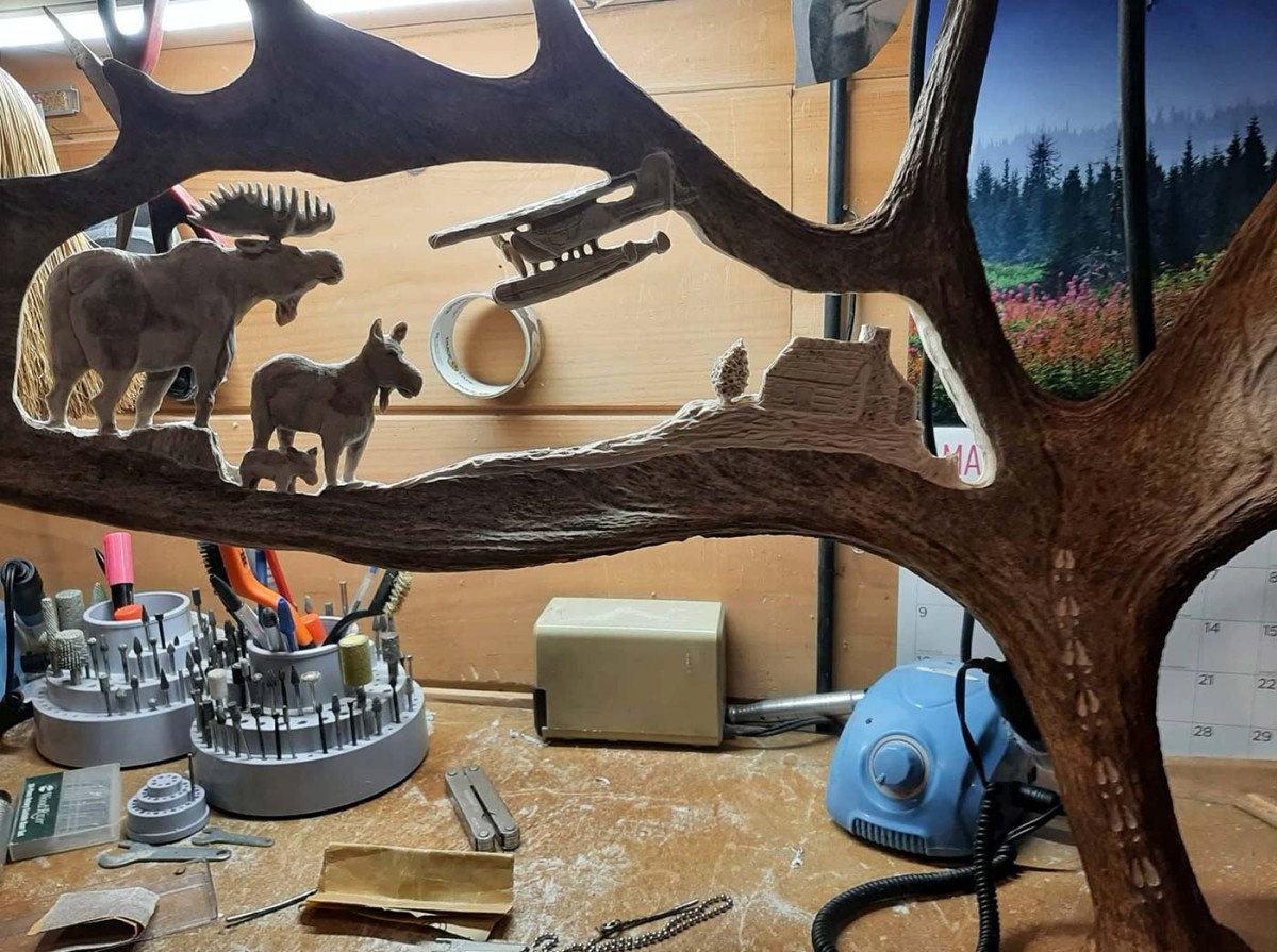 I have been looking for moose antler sheds for over 30 years. I always thought they were neat, and folks from away were looking to buy antler sheds. I started selling my collected antlers to people from all over the U.S., including a woman in Minnesota, Nancy Sager, who carves moose antlers and gives classes on carving. She invited my wife and myself out to her home to take a class in 2015, and ever since then we have been carving antlers with scenery, animals, cabins, and anything else that our customers request.