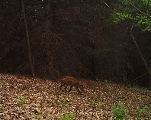 Transition zones are attractive to many mammals, so we set this camera trap up on an edge where a stand of spruce met a stand of maple. Over the next few nights we captured images of skunks, fishers, and deer, but most noteworthy was this unfortunate fox, who’s afflicted with a bad case of sarcoptic mange. He looks even more pitiful when compared to the healthy red who visited around the same time.