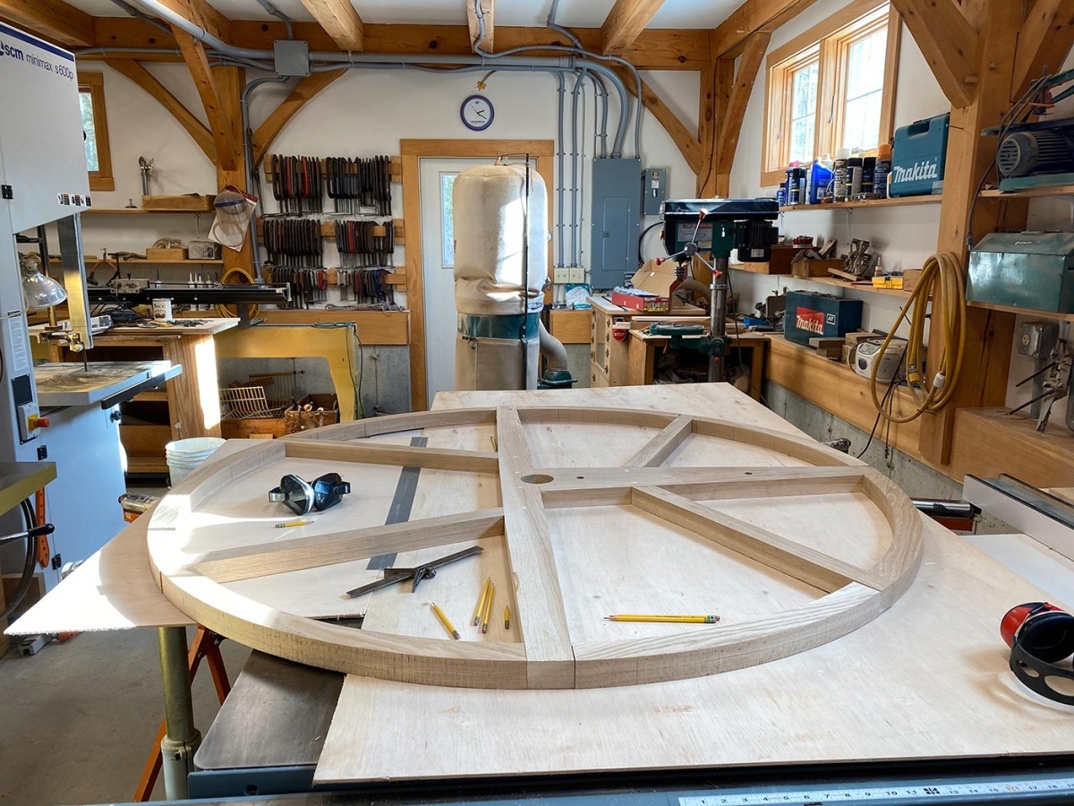 Lisa: Where we live now is on 6 six acres, surrounded by a 766-acre nature preserve on three sides. We were thinking of selling the land, but instead we decided to sell our old farmhouse and our giant barn, which was our woodworking shop. Shelter Institute, which is a timber frame company and a school, is close to where we live. Before we moved here, Joe really wanted to take their 2-week course on timber framing. So he took that course one winter, and in the class, they built a 24-by-24-foot frame. They sold us two frames, we put them together, and that’s what we made the shop out of. Then we cut the frame for the house ourselves. It took us three years to build a 1,200-square-foot house. It’s such a beautiful house. It’s perfectly sized. Joe made all the built-in shelves and almost all the furniture in the house. And then, whenever the Shelter Institute guys had a class – before Covid hit – they would bring the students here, because our shop is timber frame, our house is timber frame, we have a big woodshed that’s timber frame – so they bring everyone here and show them around.