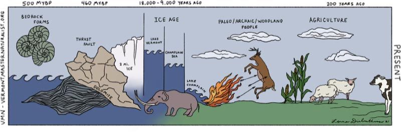 I like being able to teach at this hyper local scale – we can zoom right in. We tell the story in chapters: bedrock and surficial geology, soils, plants and natural communities, wildlife, human land use beginning with the Abenaki through to today. It can be a lift to get people interested in geology, but once you get people to look at it, they see it plays a huge part in organizing the landscape. I designed it with help from a lot of other programs and people: Maine Master Naturalist, UVM Field Naturalist graduates, Tom Wessels, Laura Meyer, who is the alumni coordinator and has been a huge help from the start. And I’m always inspired by the people teaching with me, and the ways they talk about things and resources that they pull in.