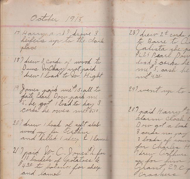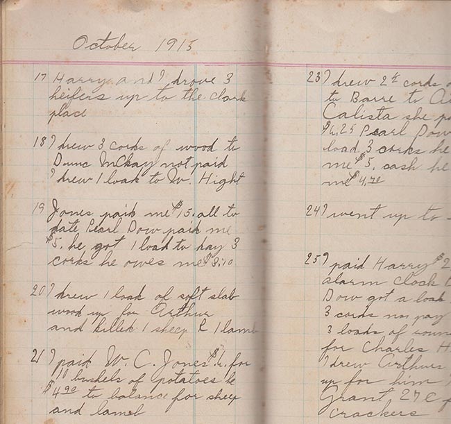 Oct. 2, 1915: Harry and I went over to East Barre. W.C. Jones paid me $13.70 for 2 sheep and 2 barrels of apples. I paid $1.57 for grain. Rained most all day.