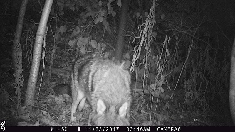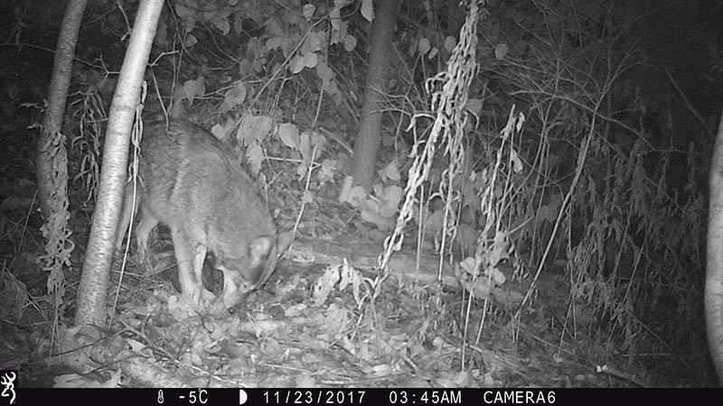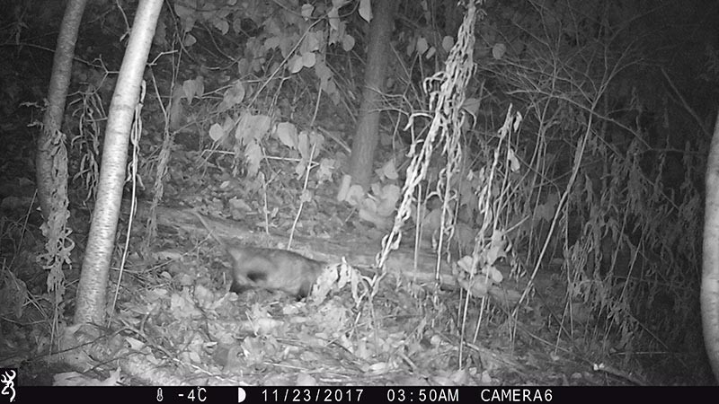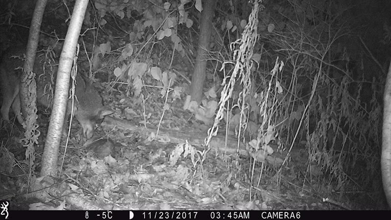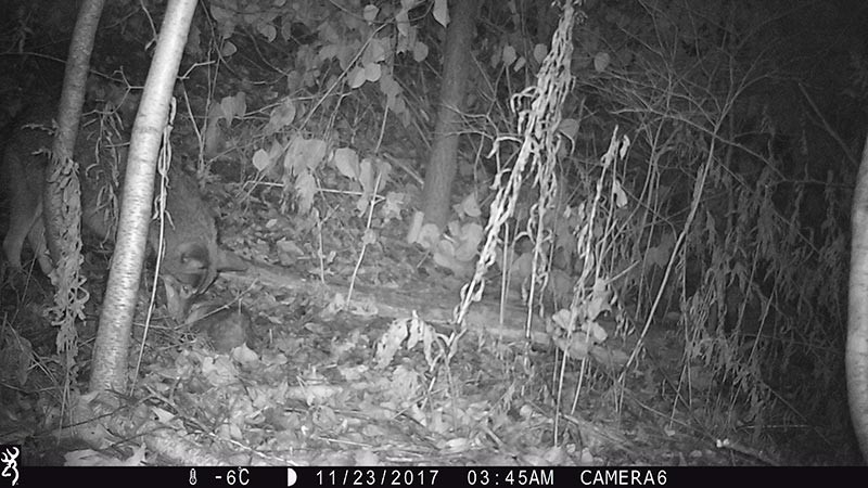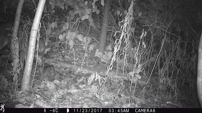 When clicking through infrared-flashed night-time photographs rapidly, it looks like an old silent movie. Frames follow frames and it’s tempting to think that the camera found grand central station for commuting mammals instead of a quiet patch of forest in Vermont. In reality, most animal visits were separated by hours or even days and they were in little real danger of bumping into each other.