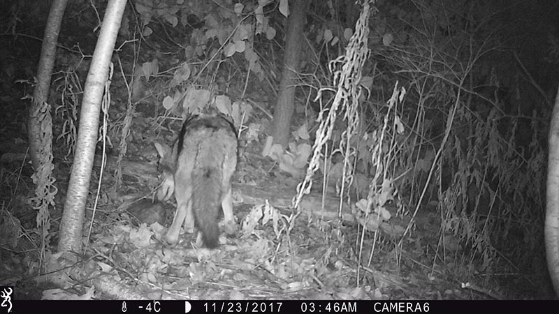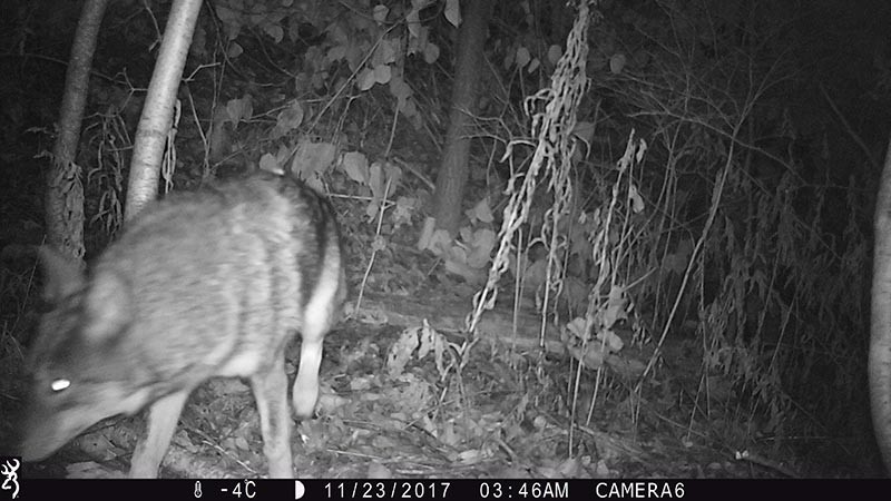 Except for the sequence on November 23 of this year, when two animals got close indeed. The first entered the bottom of the frame as a blur of fur that in the second frame flopped into a nondescript lump . . . directly at the feet of a large coyote. The coyote sniffed the lump, and nudged it enough to move it before stepping over it. After one more investigative sniff, the large canid left the scene and the “lump” remained static.