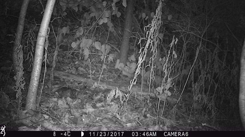 A full four minutes passed without any movement to trigger the trail camera. Then the lump was suddenly animated and walked away hauling its little rat-like opossum tail behind it. Although I had long since learned what 10-year-old Declan could not believe, that opossums do in fact “play possum,” it was pretty amazing to see it play out on a trail camera.
