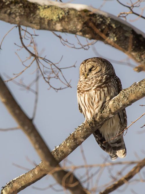 This winter, a barred owl has been loitering around my house. My husband arbitrarily declared it a male (there’s no easy way to sex an owl) and we dubbed him Squinty McBold. “Bold” because he seems indifferent to our comings and goings across the lawn, “Squinty” because of his appearance in the early a.m., when we pass under his favorite sugar maple perch. As we walk by, carrying kids and bags to the car, his head swivels and his lower eyelids open, but not all the way. He closes them again and settles back into his nap.