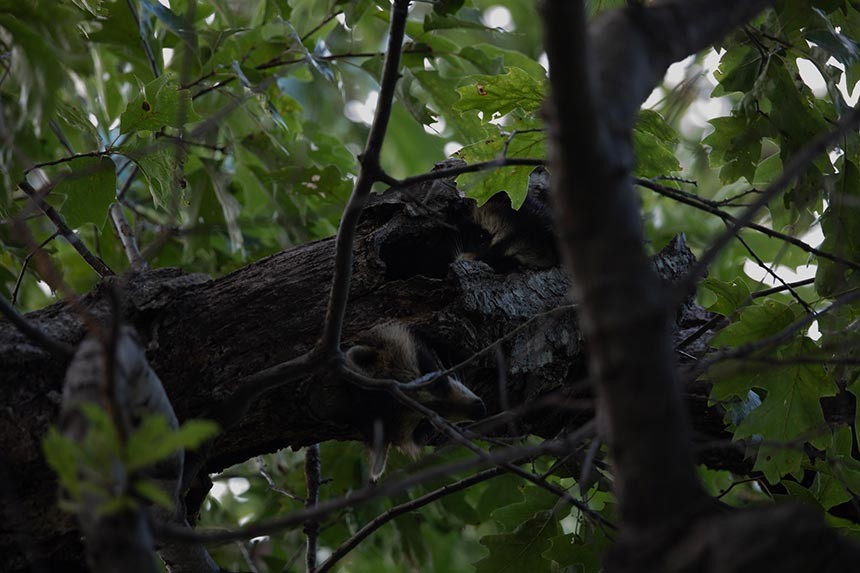 Here’s an example of how modern equipment can offset difficult lighting conditions. Photographer Tig Tillinghast took these images of young raccoons at twilight; the final photo has been darkened down in post-production to approximate how the scene appeared at the time to the human eye.