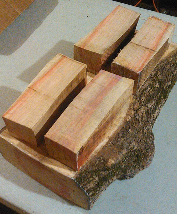 One of the cool things we found was a pile of box elder rounds that the power company had cut while clearing wood away from a power line. Some of the pieces were just exquisitely flamed – woodworker vernacular for bright red patterns in the heart. The wood looked like it was just going to waste, so I turned the stroller into a forwarder and hauled the butt bolt home, ignoring the perplexed looks on the faces of the drivers in the passing cars who were no doubt wondering about the man carrying a baby while pushing a log in a stroller.