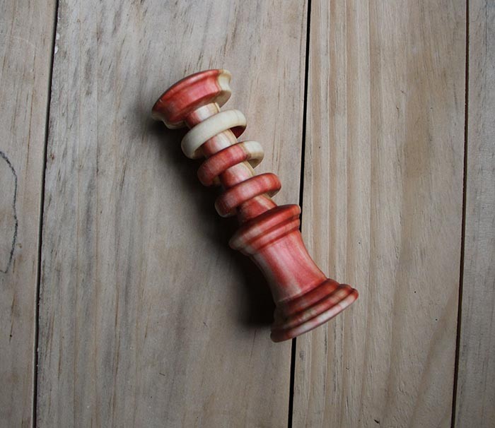 I slabbed it and put aside boards of varying thicknesses for future projects. Then I let the heartwood dry for 10 months and brought it to Joe Comi, a woodturner who lives in Pownal, Vermont, and asked him if he could make a rattle out of it. He said: “can do,” and a few weeks later I had a functional toy and a beautiful family heirloom that an artist/craftsman had made by hand out of wood that had a story.