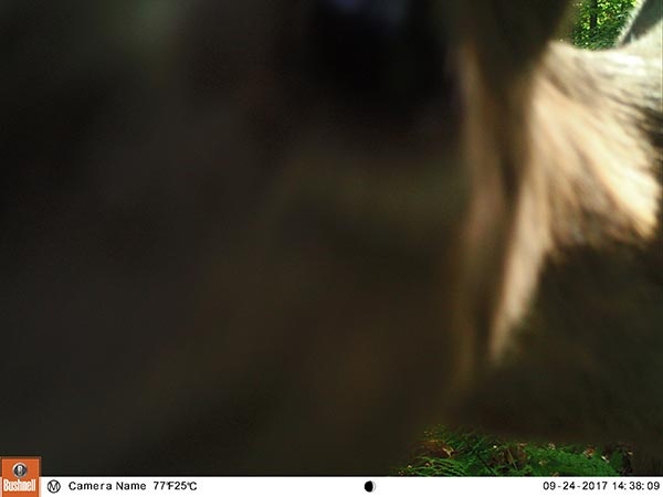 In the next series of photos we see a 5 1/2-month-old buck fawn – isn’t he cute? In the pictures taken on September 22 he takes in the camera briefly before scampering over toward mom. Two days later he returns and really examines the camera, in one shot eating in front of it. (I can’t tell exactly what kind of plant that is in his mouth, can you?) What I found interesting about the series of pictures on September 24 is that you get a good look at the fawn’s flank, and he’s still largely covered in his red summer coat. The mother, though, in the last shot, has molted and is growing her winter coat of gray, hollow, insulated hairs. Where it comes to this molt, the conventional wisdom is that it’s triggered by the animal’s pineal gland in response to seasonal sunlight variations, which I certainly don’t dispute. But I think temperature must also play a role, in the same way that trees take their cues for bud break and leaf drop from both their internal clocks and external temperatures. I’d guess the fawn’s molt was delayed somewhat by the freakishly warm September temperatures we had.