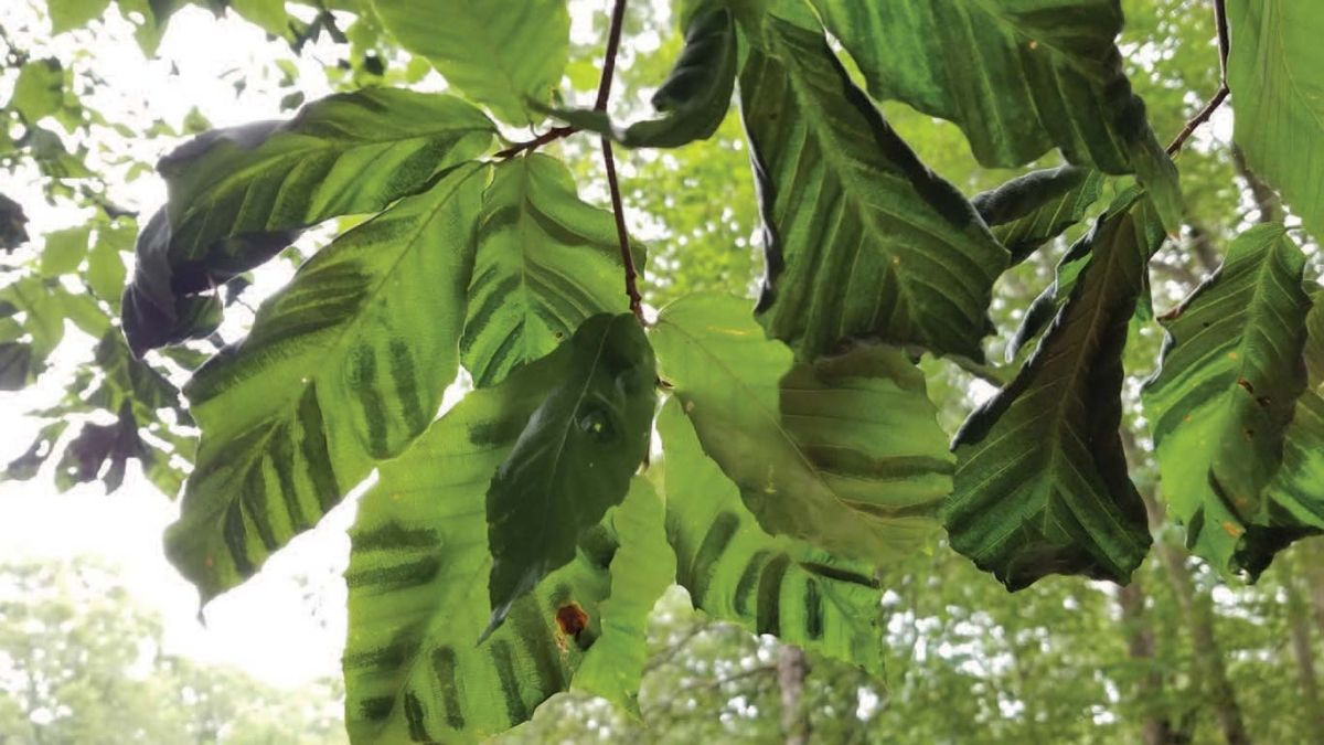 “On infected trees, you can see very distinctive stripes between the veins of the leaves,” said Faubert, a member of the Beech Leaf Disease Working Group organized by Ohio State University researchers. “The whole region between the veins is a deep green, so if you hold a leaf up to the sun, you can see dark bands running parallel to the veins. We believe the nematodes are overwintering in the buds, and that’s where the damage is happening, because when you look at the mature leaves you don’t find the nematodes.” She said the energy expended to regrow leaves after infected leaves fall off causes great stress to the trees, and if it happens several years in a row, the trees often die.