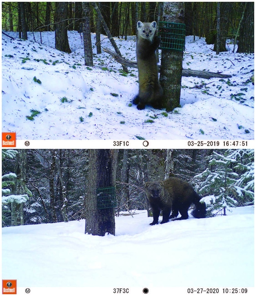 The American marten (Martes americana) and fisher (Pekania pennanti) are closely related inhabitants of the Northern Forest region. Both species have been impacted by historical trapping and forest clearing. Disturbance to their forest habitat remains a threat, especially in northern Maine, where the two species overlap. To learn more about how marten and fisher coexist, how they might be affected by timber harvesting, and how to inform wildlife management and conservation efforts, researchers at the University of Maine conducted a nearly statewide survey of marten and fisher. Bryn Evans and Alessio Mortelliti used camera traps at 197 sites, taking more than 800,000 images over a period of four years. They then analyzed the images for marten and fisher occupancy patterns, which they then correlated with forest disturbance (based on satellite imagery), trapping intensity, and snow depth. Deeper snow is thought to favor martens, giving them access to prey and a refuge from fisher.